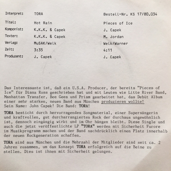 Vinyl / Tora (8) - Hot Rain / Pieces Of Ice