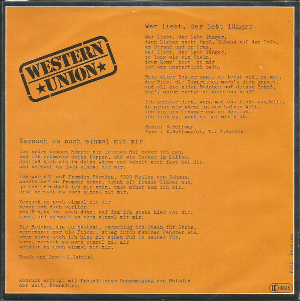 Vinyl / Western Union (3) - Wer Liebt, Der Lebt Länger / Versuch' Es Noch Einmal Mit Mir