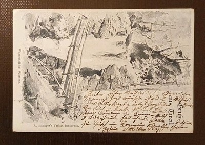 Eine eindrucksvolle und seltene historische Ansichtskarte, die den Wasserfall bei Wattens in Tirol zeigt – ein atmosphärisches Naturmotiv, das die dramatische Schönheit der alpinen Landschaft perfekt einfängt. Ein authentisches Zeitdokument mit besonderem Sammlerwert.